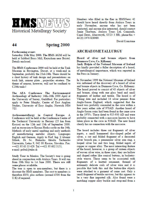 Contains: *Hoard of silver and bronze objects from Dunmore Cave, Co. Kilkenny. *The Henry Cort Millennium Project, Fareham. *Isaac Wilkinson (1704–1784) and the Little Clifton Blast Furnace (1723–1781)