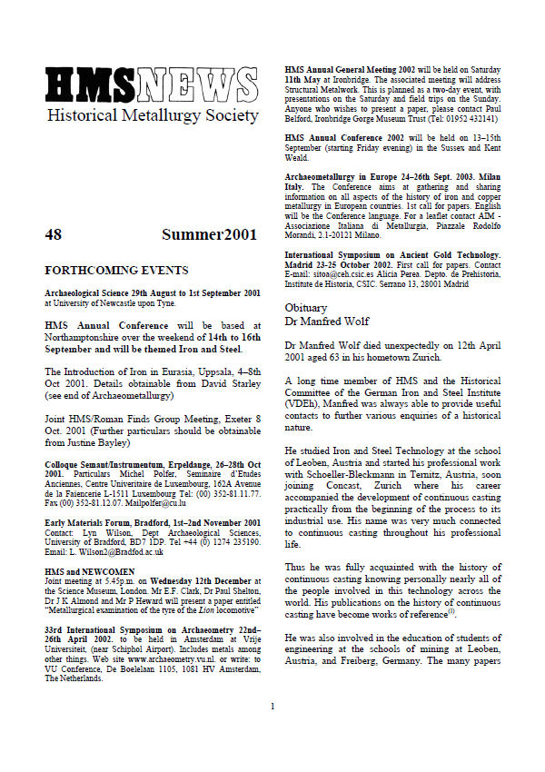 Contains: *Tondu Ironworks excavations. *Earliest French chalcolithic copper smelting site. *Investigation of copper ores from northern Italy. *A New Timna Mining Park. *Blast Furnace excavated recently in Henan, China.