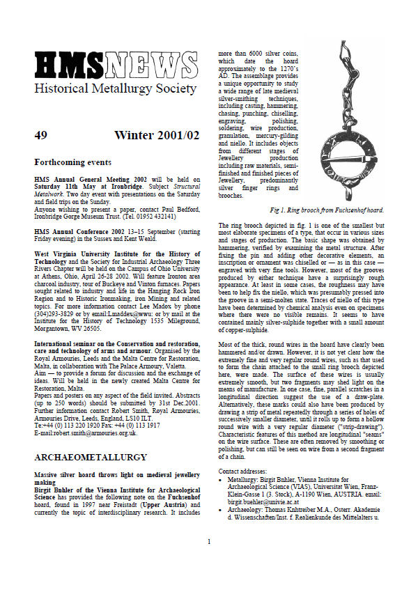 Contains: *Massive silver hoard throws light on medieval jewellery making. *The earliest alloy steel? *A real sword in the stone in Tuscany. *New research into metallurgical activity in SW Bulgaria, Argentina, Sudan et al.