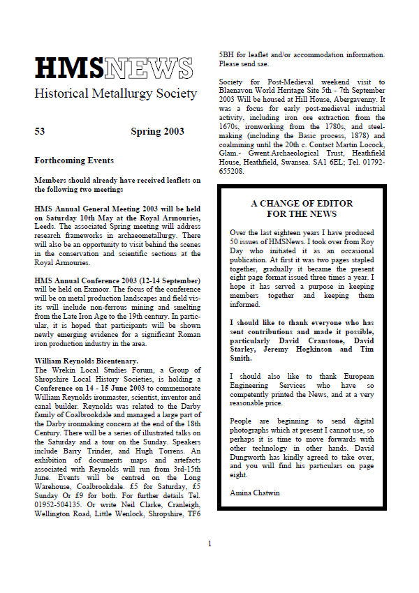 Contains: *Wortley Top Forge. *Examination of a Crucible Steel Mirror in the British Museum. *Aspects of the Tin Industry in South West England.