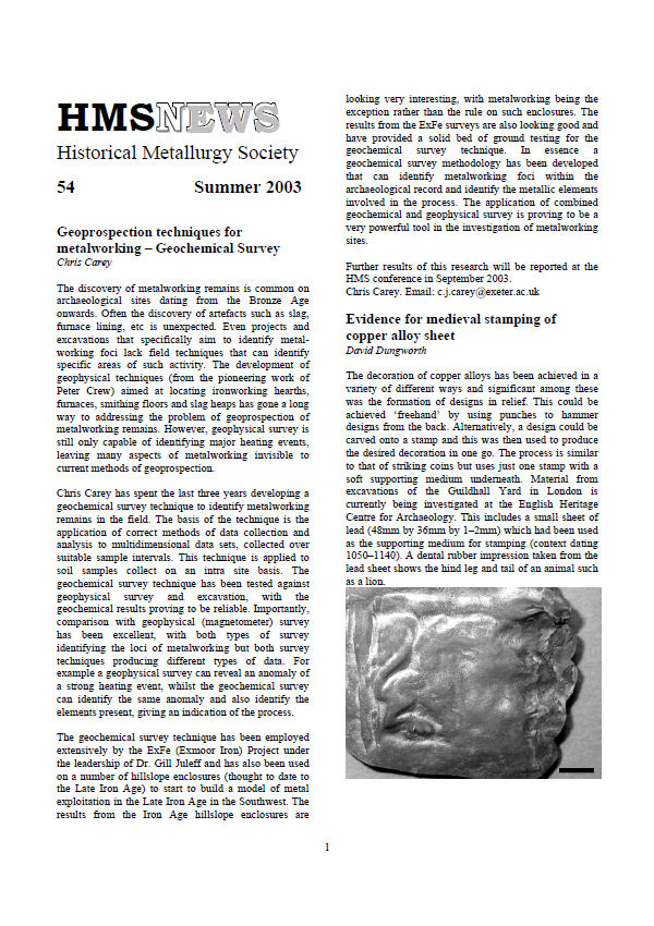 Contains: *Geoprospection techniques for metalworking. *Evidence for medieval stamping of copper alloy sheet. *Blacksmithing in 1st Century BC Pompeii.*Europe’s earliest brasses? *Lead Smelting at Combe Martin, Devon.