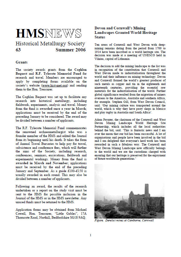 Contains: *Rio Tinto. *Recent Work at AMTeC Co-op: X-rays, casting & education. *Lorn Pig Iron Used for malleable cast iron locks in Staffordshire in 1863. *Metalworking at Mont Beuvray (Bibracte), France