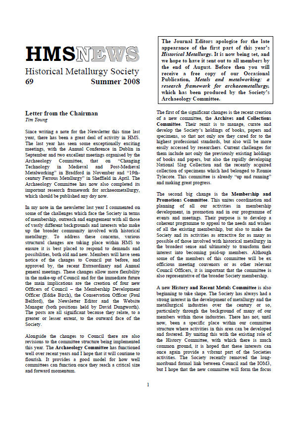 Contains: *An Early Zinc-smelting Retort from China. *Iron and cast iron in China: report of a mission. *Iron-smelting in Kamalia, West Africa. *Casting pre-experiments of copper hammer and adze-axes from the Carpathian Basin. HMS News: Issue 69Summer 2008 Main contents include… An Early Zinc-smelting Retort from China. Iron and cast iron in China: report of a mission. Iron-smelting in Kamalia, West Africa. Report on actualistic casting preexperiments – The copper hammer and adze-axes from the Carpathian Basin. Download Newsletter Here HMS News 70 HMS News 68