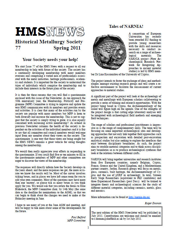 Contains: *The Metal Workshop at Tell Tayinat, Turkey. *Clay mould pieces from Bourton-onthe-Water, Gloucestershire. *Bronze Age metallurgy in the Southern Urals. *HMS Members Solve Mystery?