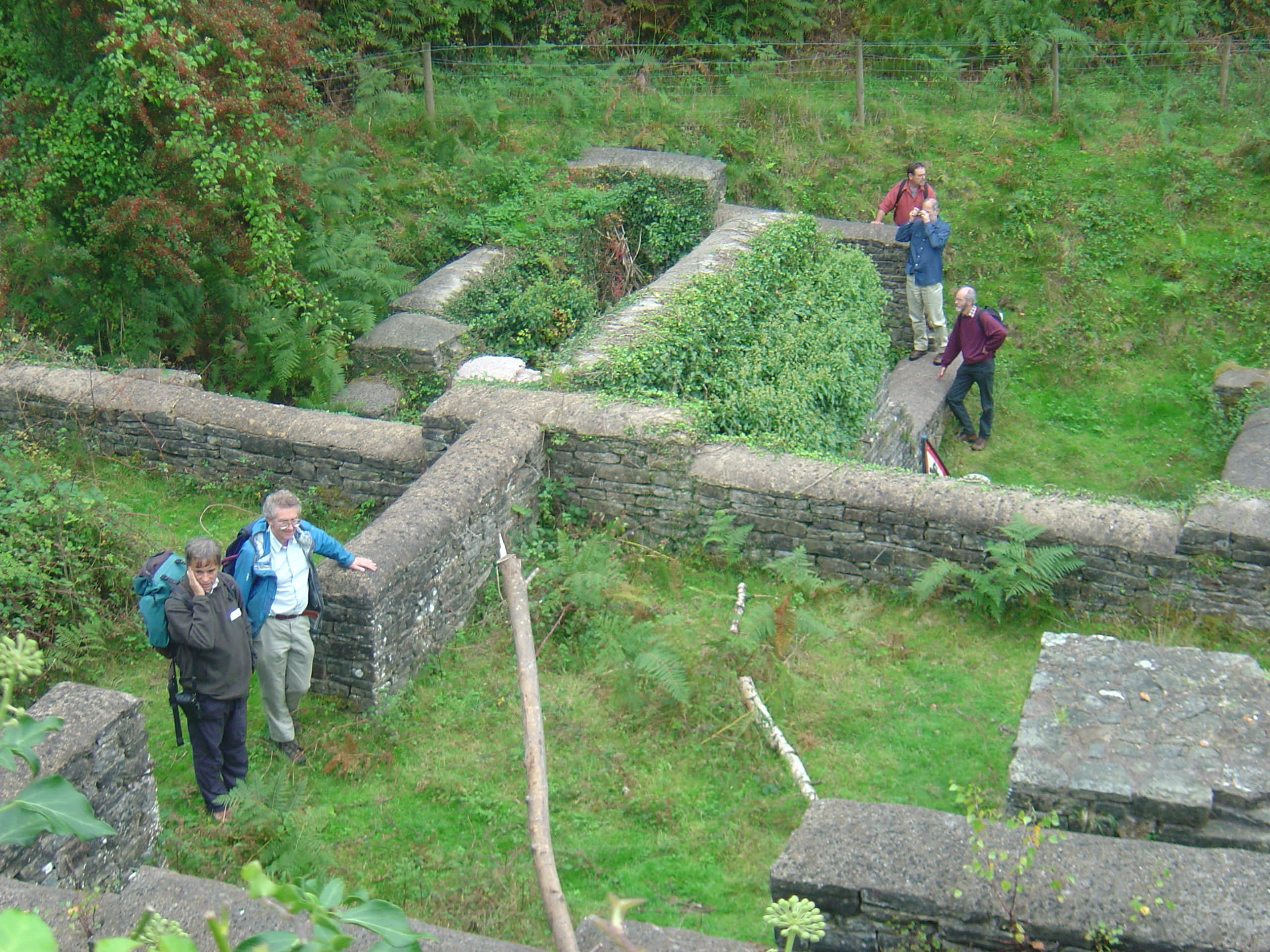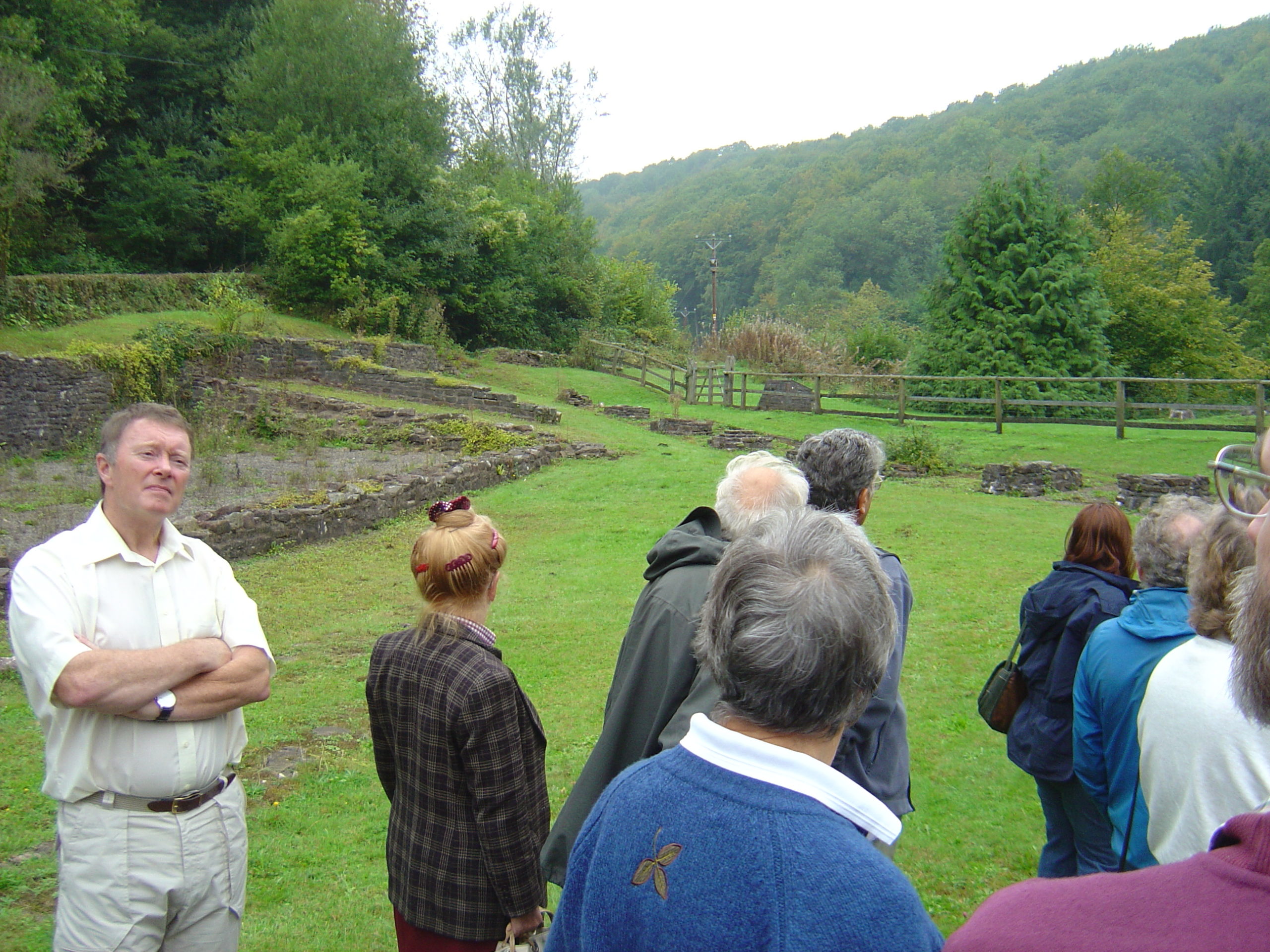 Our first stop, Tintern, was the site of the first waterpowered wire works in Britain, in about 1556. The works were controlled by the Mineral & Battery Company. Wrought iron for wire drawing required ductility and this was supplied as ‘Osmond Iron’ by the Monkswood Furnace between Usk and Pontypool. There appear to have been two furnaces at Tintern; one near the river built on land of the Earl of Worcester and first documented in 1629. The second, which we visited, was a site well up the Angiddy Brook. It is first mentioned, in 1669, in the Foley accounts and by 1707 John Hanbury and George White were supplying pig iron to the Knight’s Stour partnership. The furnace was long lived, eventually closing around 1828. Towards the end, David Mushet used it for experimental smelting of Indian wootz ore. The site was excavated and conserved under the direction of John Pickin in 1979–80 who fortunately was with us for the conference and we benefited from his guidance. The site, once a meticulously excavated site, was now very overgrown and a good example of what happens to sites if they are not looked after and conserved regularly.
