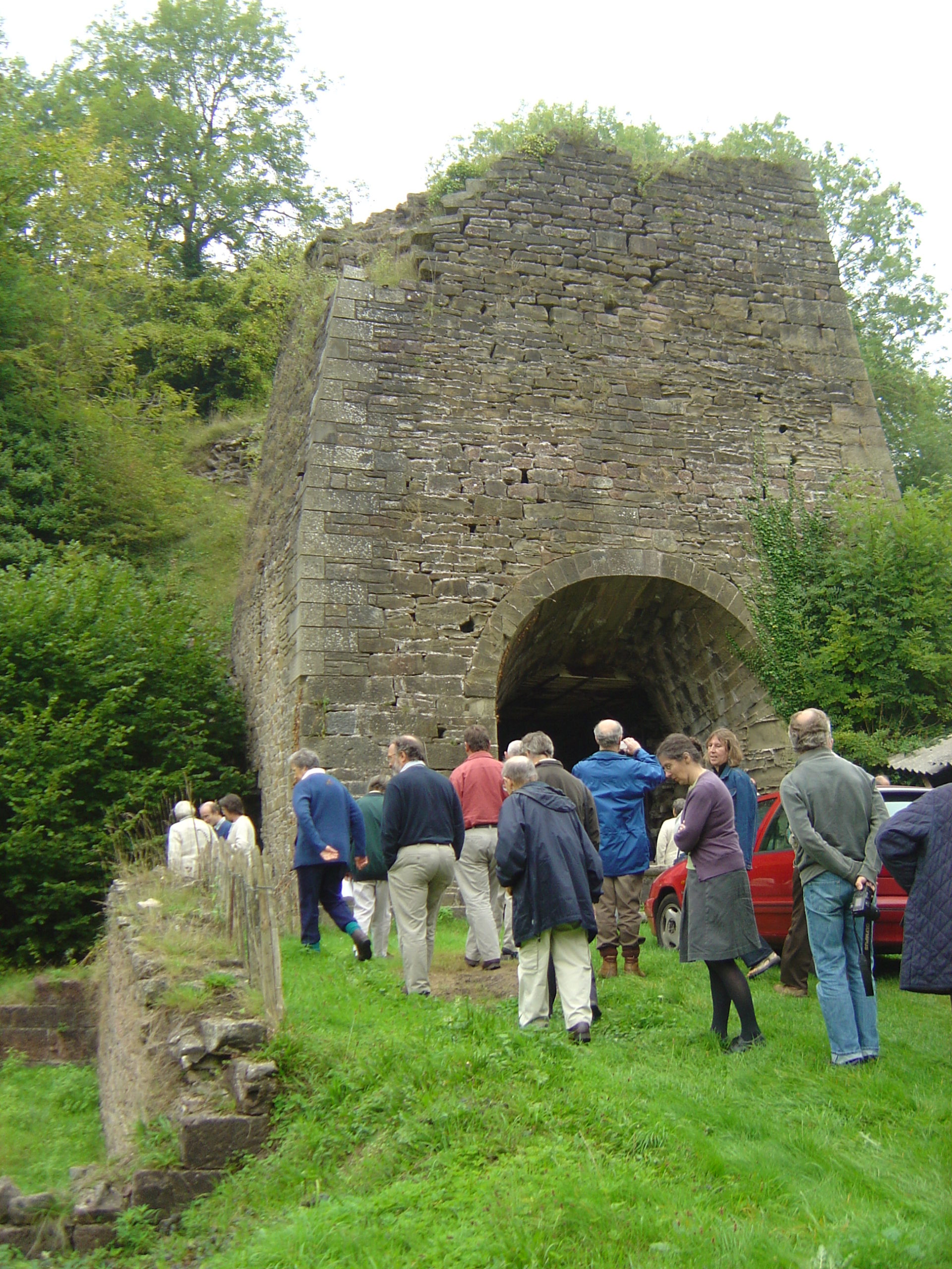 We then stopped at Whitecliff furnace, a cold blast, coke fuelled furnace stack, built and rebuilt 1798 to 1810. The surviving stack is probably the second furnace and was refurbished by David Mushet between 1809 and 1811. A massive inclined way from the valley floor gave access to the charging platform. An abutment for a charging bridge indicates that a third furnace was planned. The site also accommodated a paint works and several interesting personalities. Mushet’s endeavours were not successful and the works failed before 1816. The stack has received five stages of conservation repairs and more are planned by the owners, Dean Heritage Museum Trust. I am sure that many members remember the fund-raising efforts of the Society to ensure that the site was bought and preserved and it was good to hear that the site is being cared for and it was particularly appropriate we should visit as a society.