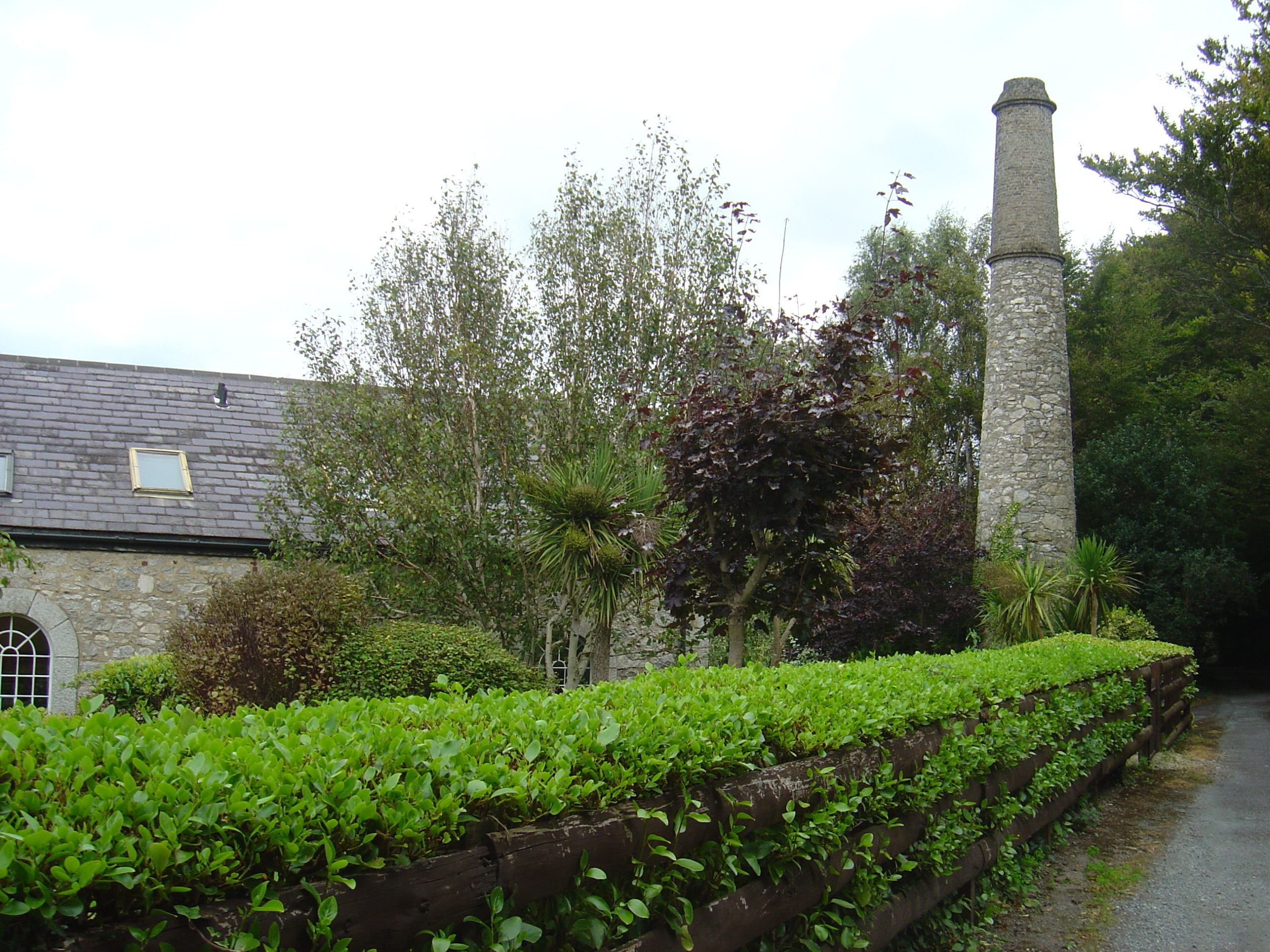 Further up the hill was the shot manufactory building, now a private residence. The shot tower was demolished some years ago but a free-standing granite chimney still survives revealing the location of the smelter. The melted lead formed spheres during free fall through the 45m (150ft) vat of water. To create the vertical drop required the shot tower was located above an abandoned mine shaft, with the extra height gained by adding the tower above. The spheres once collected were sorted, polished, graded and bagged in the riddle building prior to being sold.