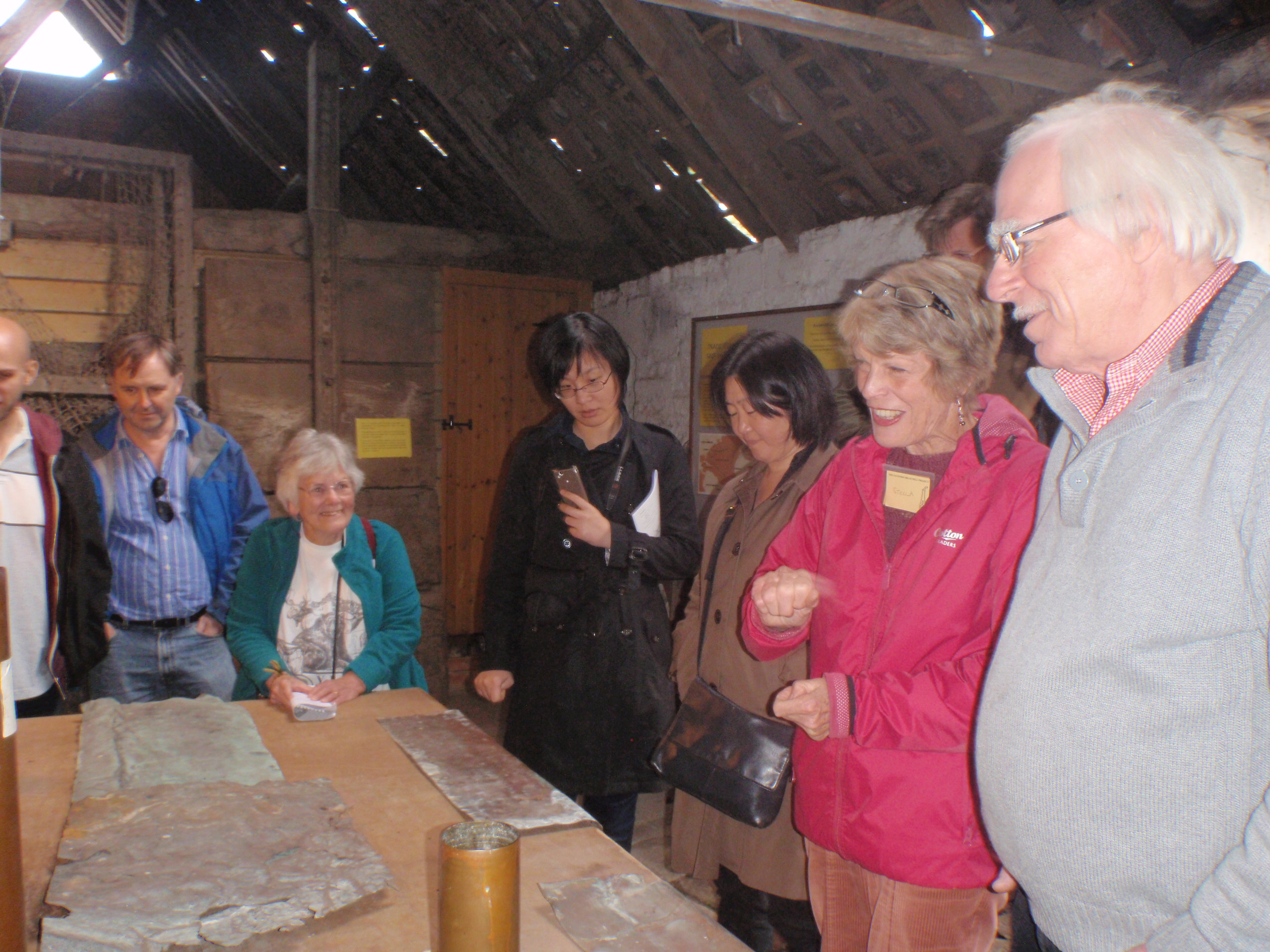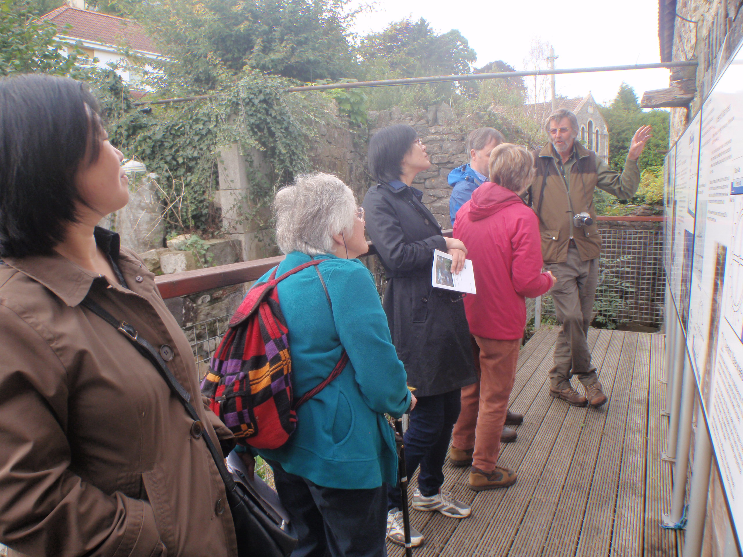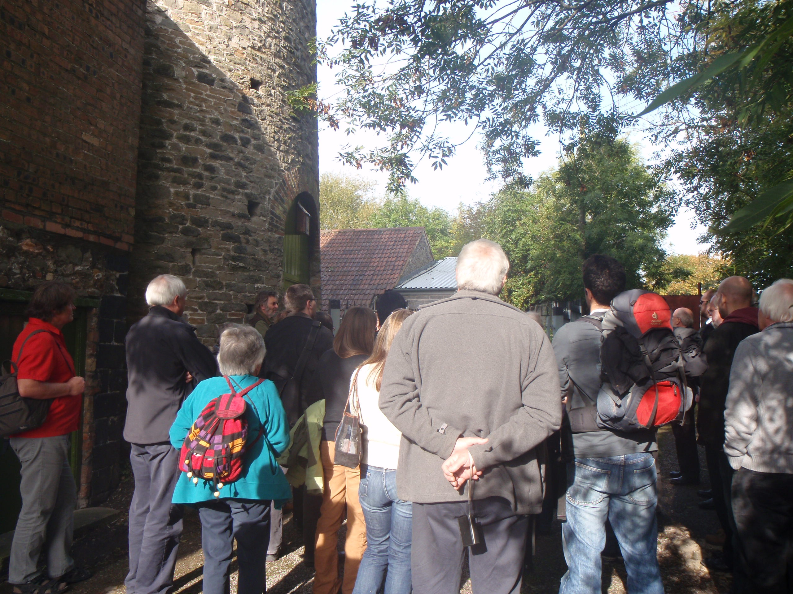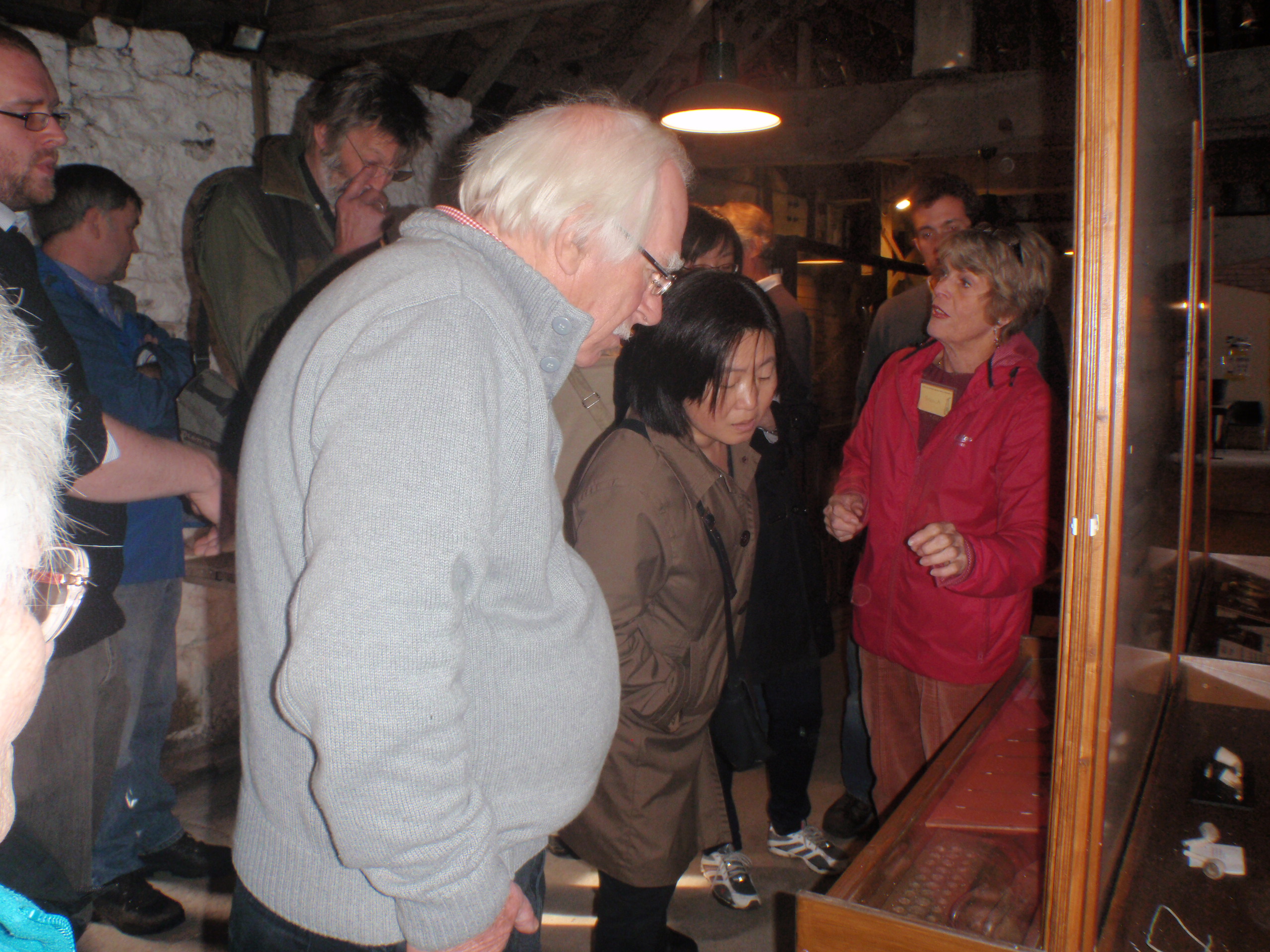 The Sunday programme of field tours proved to be equally captivating. The first visit was of the Warmley Brass and Zinc Works discussed the previous day by David Etheridge. This complex was the first to produce zinc metal through the distillation process to make high zinc brass in Britain starting in the 1740s. The walk through the patchy remains of William Champion’s estate was very interesting although at times puzzling and mystifying. The slag-block summer house, and slag-clad concrete statue of Neptune, and slag-lined grotto complete with industrially warmed waterfall, were particularly inspiring! Following a delicious Sunday carvery lunch at the Riverside Inn, we continued the day’s activities at the Saltford Brass Mill where Tony Coverdale and Joan Day gave a riveting tour. This mill is a prime example of what would have been a complex of mills scattered throughout the region working brass ingots into sheets and then into the various hollow-ware vessels destined for export. The grounds are dominated by several watermills that were used to roll the ingots into sheets and to power large “battery” hammers.