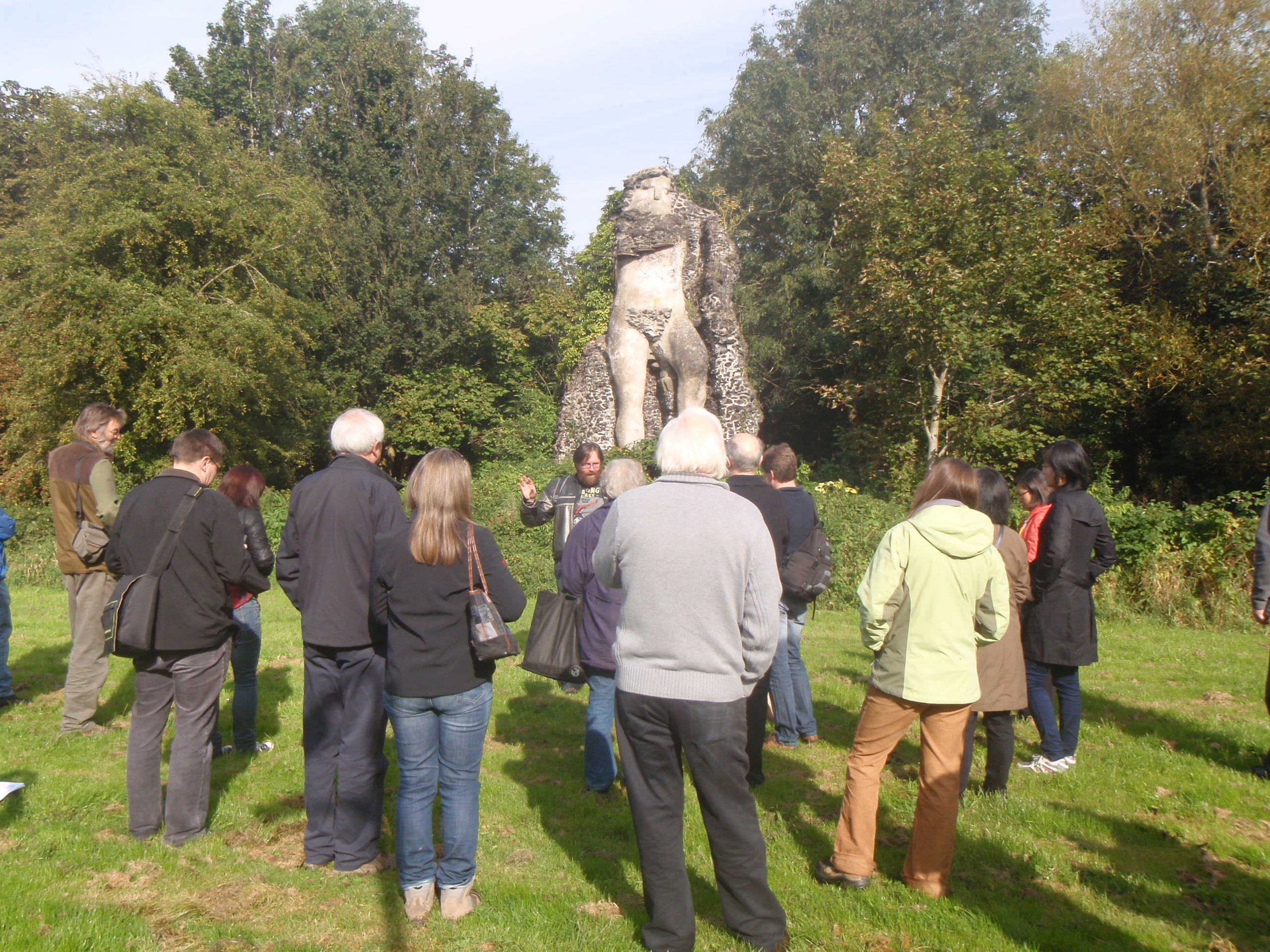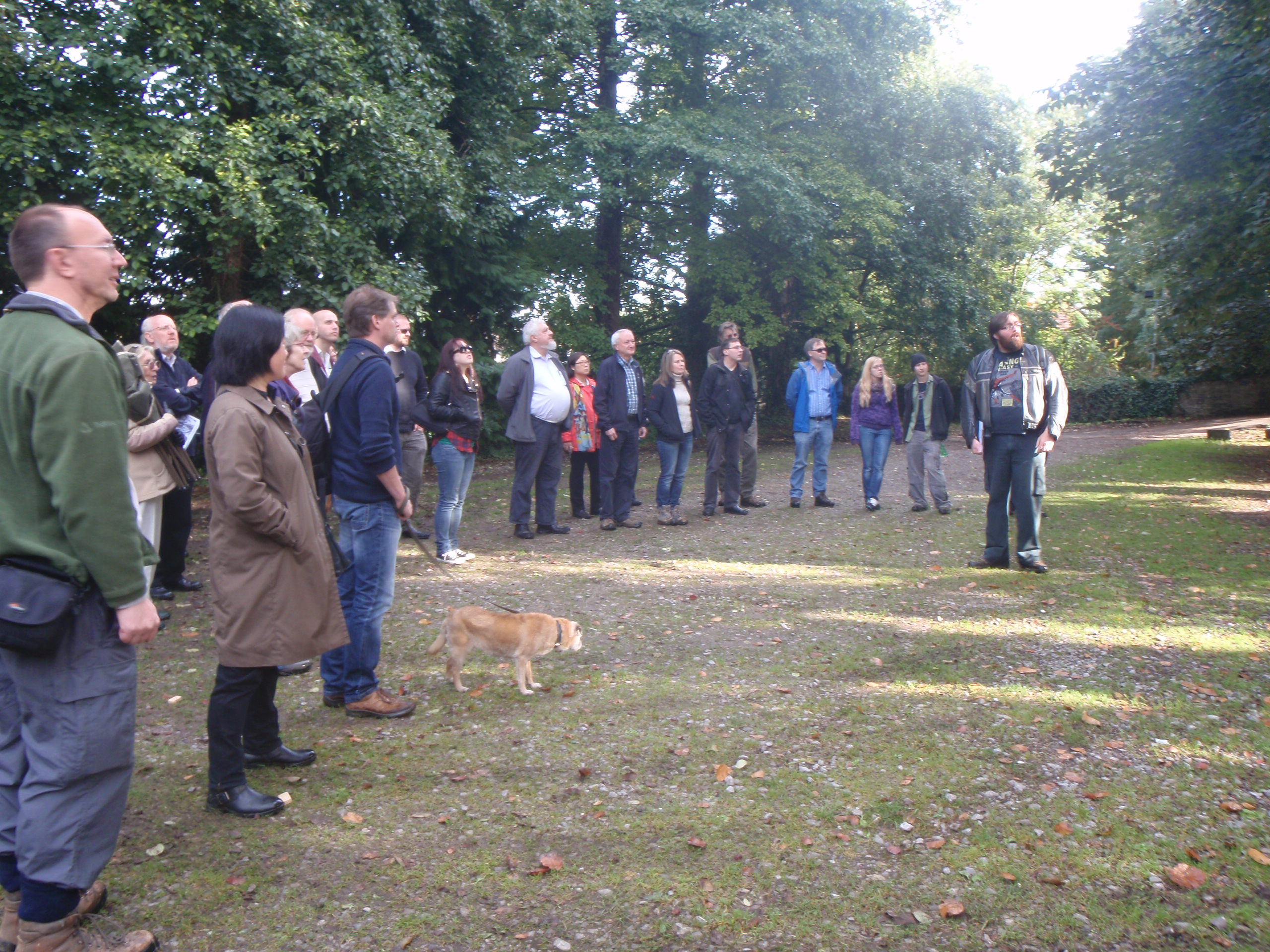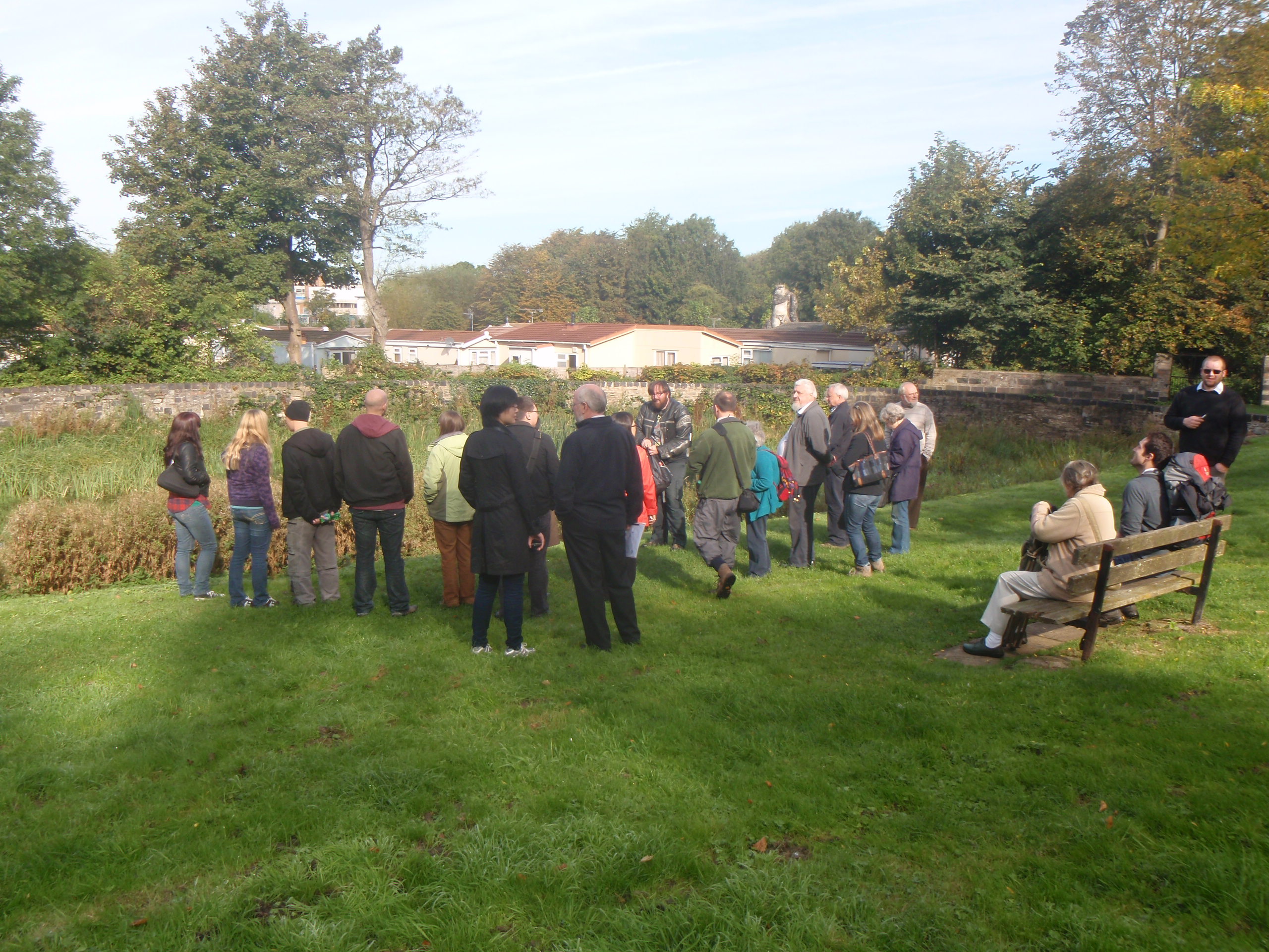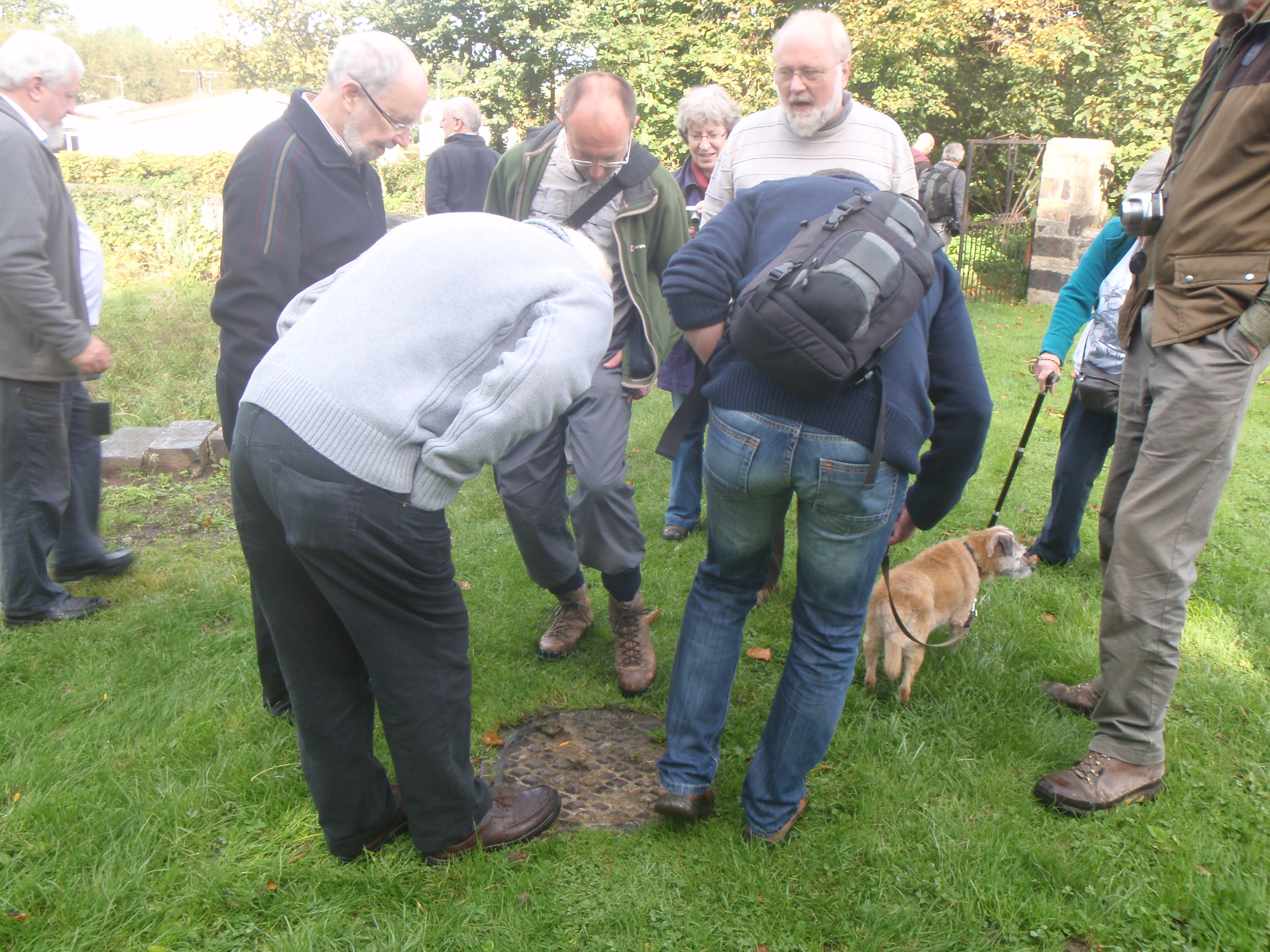 The Sunday programme of field tours proved to be equally captivating. The first visit was of the Warmley Brass and Zinc Works discussed the previous day by David Etheridge. This complex was the first to produce zinc metal through the distillation process to make high zinc brass in Britain starting in the 1740s. The walk through the patchy remains of William Champion’s estate was very interesting although at times puzzling and mystifying. The slag-block summer house, and slag-clad concrete statue of Neptune, and slag-lined grotto complete with industrially warmed waterfall, were particularly inspiring! Following a delicious Sunday carvery lunch at the Riverside Inn, we continued the day’s activities at the Saltford Brass Mill where Tony Coverdale and Joan Day gave a riveting tour. This mill is a prime example of what would have been a complex of mills scattered throughout the region working brass ingots into sheets and then into the various hollow-ware vessels destined for export. The grounds are dominated by several watermills that were used to roll the ingots into sheets and to power large “battery” hammers.