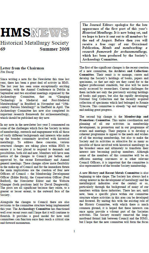 The Crucible (previously HMS News) is the informal newsletter that keeps HMS members up to date with notices, reviews and reports of relevant events and projects on archaeological and historical metallurgy. It also includes interviews, opinion and discussion essays, letters from around the world, and a list of forthcoming events. It is published three times a year.